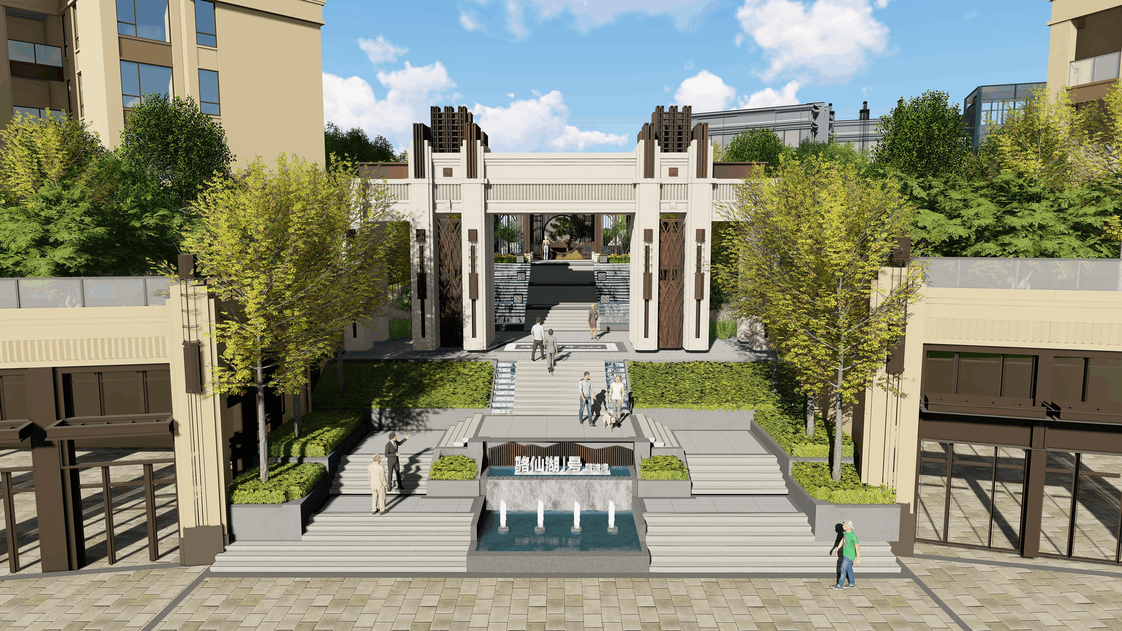 新中式景觀契合場地背山面水的特征,做差異化的景觀,展現(xiàn)精致的東方美學(xué)與經(jīng)典西方美學(xué), 傳統(tǒng)元素與現(xiàn)代手法相融合的“文化馨品”。